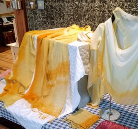 ☆薄絹ストール「花衣」 定価 33,000円 最低落札価格 3,000円 本日最終価格 3,000円  絹100%  緯(ヨコ)糸に紬糸と藍染めの絣糸を使用しています。  軽く、薄く、温かいです。男性女性問わず、ご利用いただけますよ。  送料別途請求